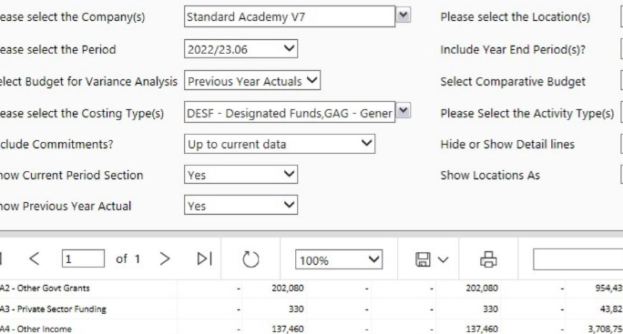 Reports on the screen need to have the header row frozen on all reports. Management accounts by cost centre does not have the header row frozen and other reports do not have this either.