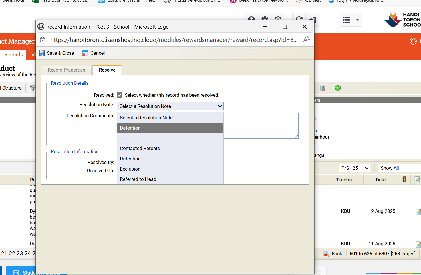 Our teachers find the next step, a real nuisance going in to the Behaviour module, and editing the Behaviour and then adding the "Resolve" to the behaviour incident that they have just created. In Edgen, the negative behaviour and corresponding sanction needs to be connected.