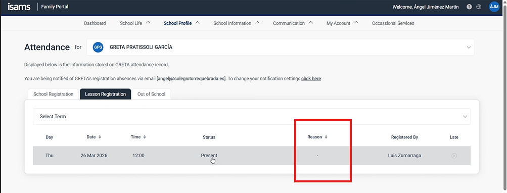 Hi iSAMS. In Parent Portal - Attendance you can see that your kid is absent in some day. But a few parents have asked the reason for the absence, because it doesn't appear. So, it would be possible to add the Registration Status that we use in the Attendance module in the Parent Portal-attendance web? So the parents will see why the kid was absent.
