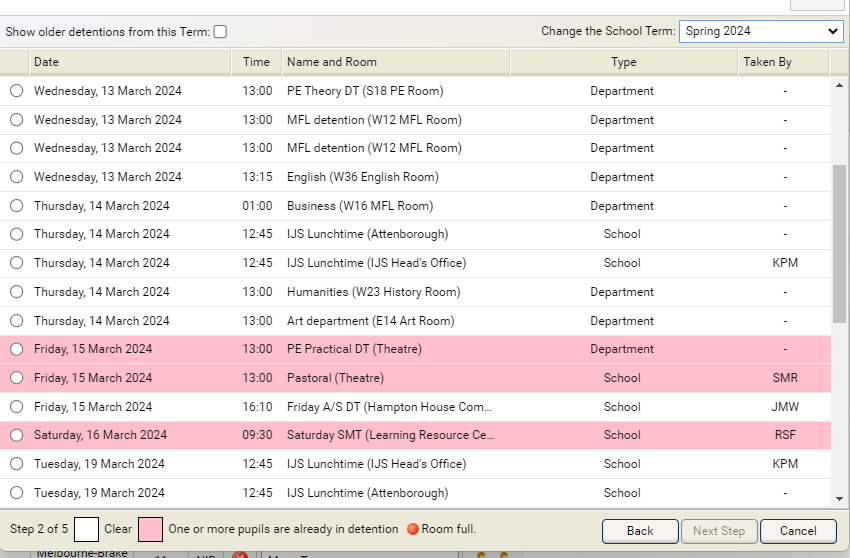 When assigning a group of pupils to a detention or wanting to move a group to a different detention, other detention slots will show red if one or more pupils are in that detention.