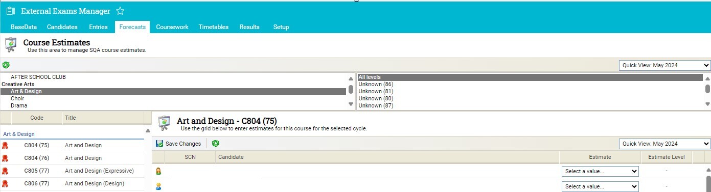 It would be VERY beneficial for teachers to be able to put their own pupil forecasts in, but have no access to the any other part of the External Exam Manager. It would be even better to lock it down so that teachers only have access to their subjects & their own pupils. I have attached an image, as you will see, because I'm an admin I have access. But for teachers to be able to do this would take a load of work off the admin staff.