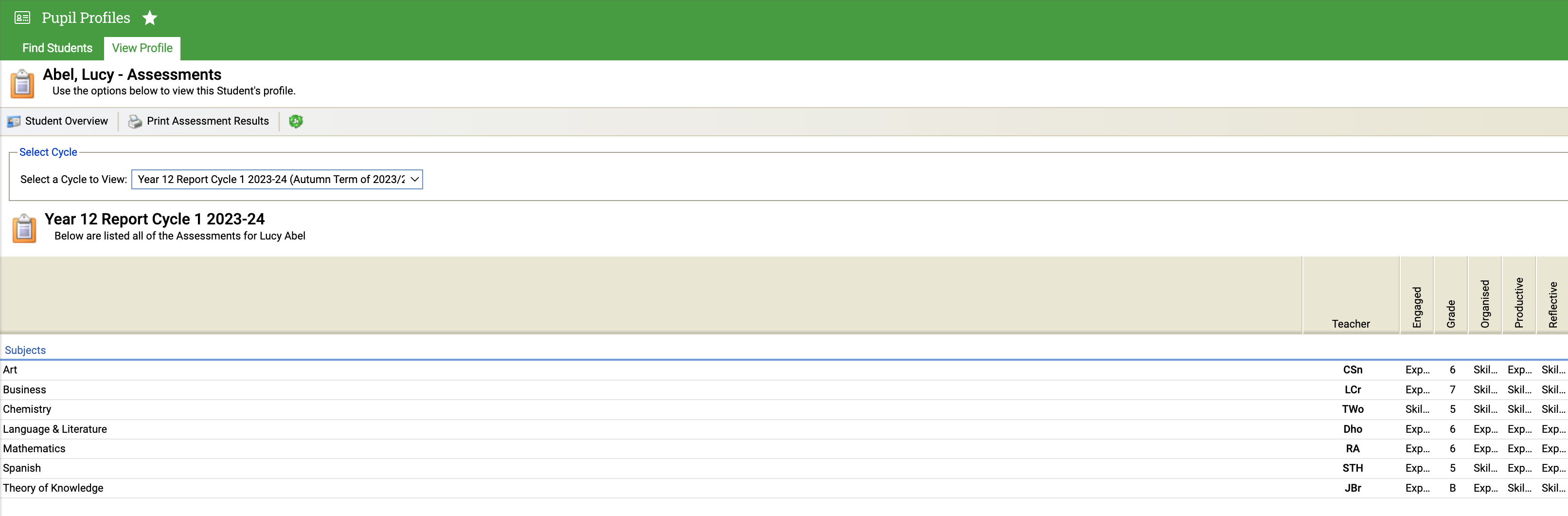See attached screen shot for Lucy Abel (School ID 141021847286), Y12 Report Cycle 1 2023-24; you can see the subjects displayed.