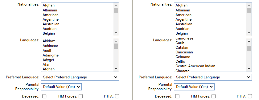 As part of the recent update on 10 January 2025, new fields have been added to the Contact Details screen to capture contacts nationalities, languages and preferred language.