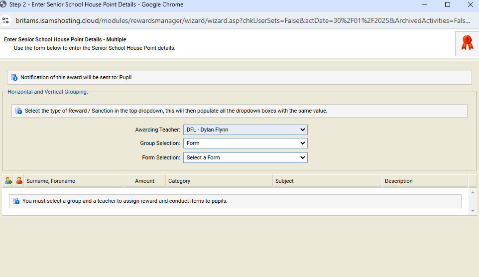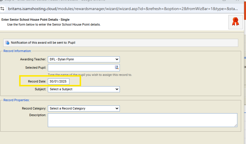 It would be nice if it was possible to change the record date in rewards and conduct manager when adding multiple records in one go. At the moment this is only possible when adding student house points/sanctions individually.