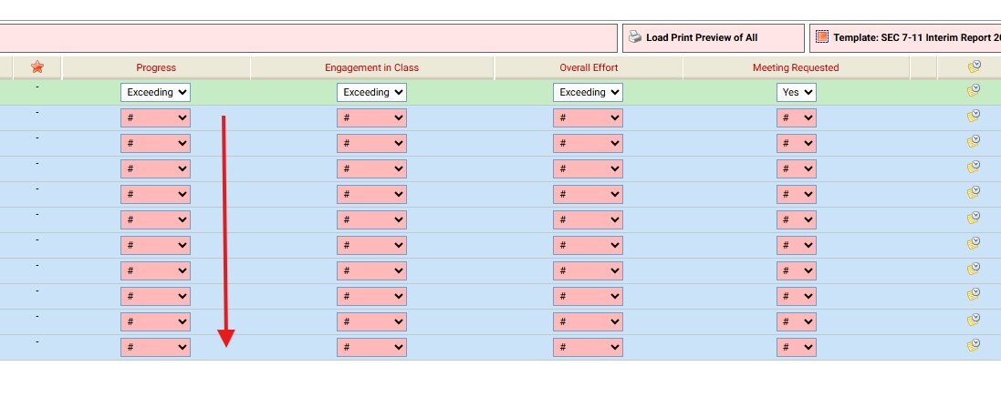 It would be more efficient for teachers if there is a fill down feature to allow the Grade or outcome apply to the entire column.