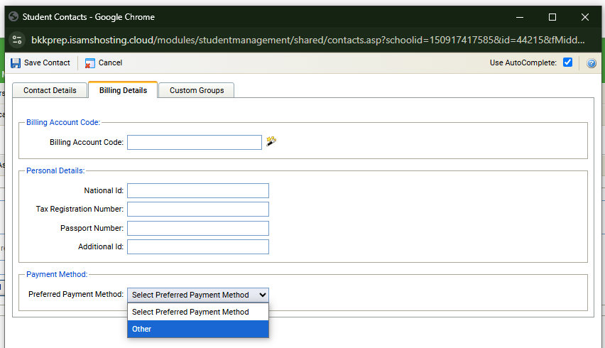 In Pupil Manager > Contacts > Billing Details, is there a way to set "Preferred Payment Method" to "Other" by default?