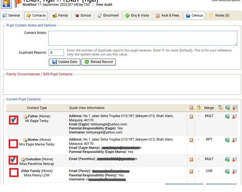 It will be useful to have a tick box next to the current pupil contacts for school to identify which of them are the emergency contact(s) for the pupil on top of the existing Family Circumstances / SOS Pupil Contacts. School can use it as an additional notes for the ticked emergency contact(s).