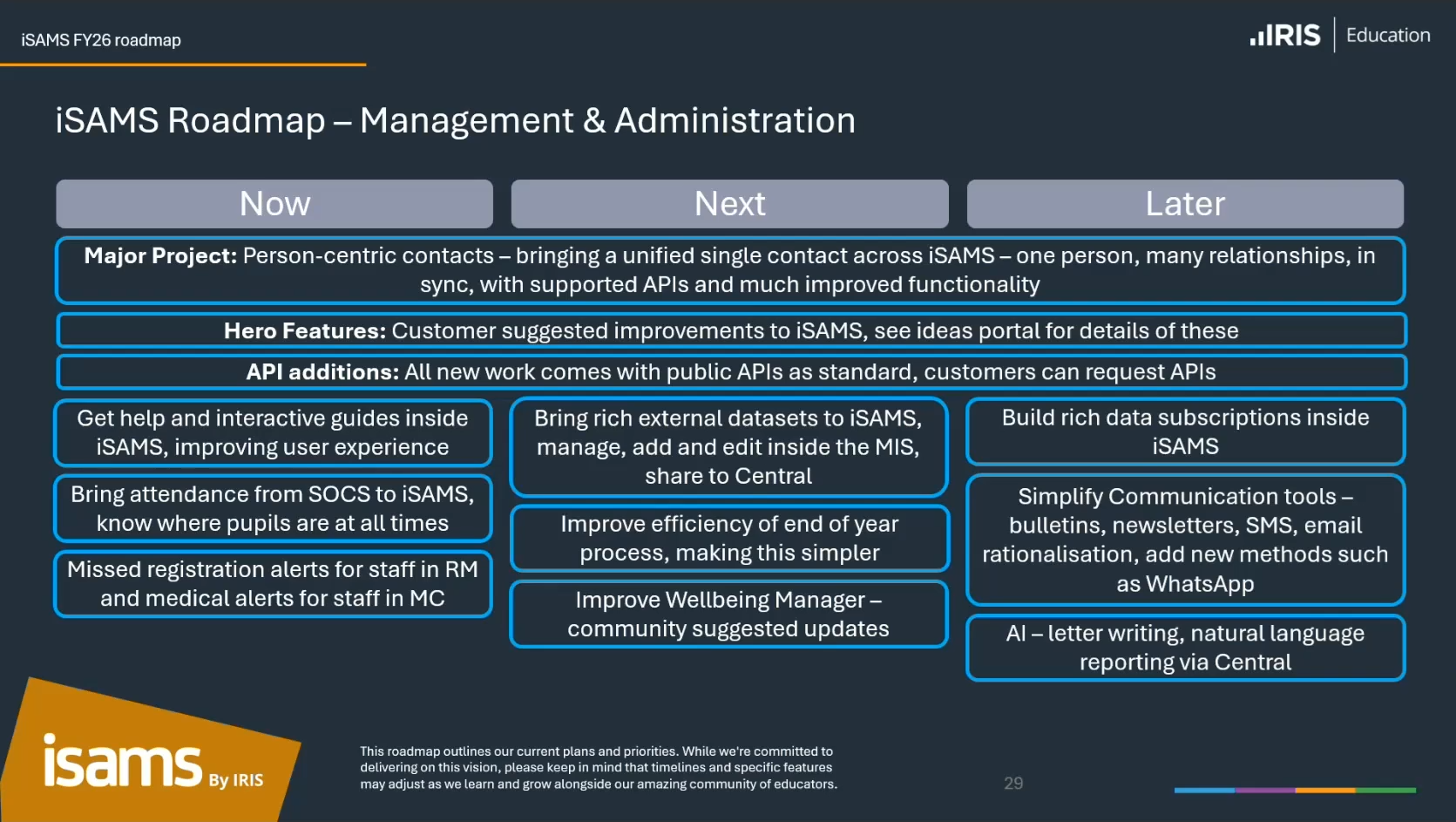 Screenshot attached is from webinar recording (from about 1 hour 5 seconds in), - https://icommunity.isams.com/hc/en-gb/categories/360002937778-roadmap