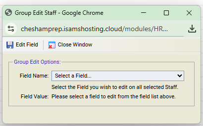 It would be really useful to be able to add a staff training course for a group of staff at once rather than going into each staff member individually and adding the exact same course and all its info (start date, end date, course institution) over and over again. This would save time when new mandatory training courses are completed by all staff members at the start of a school year/term at the same time. It would be good to have this feature within the existing 'group edit' option on HR Manager if the 'Development and Appraisal' section was just added as an optional field in the 'Group Edit Options'.