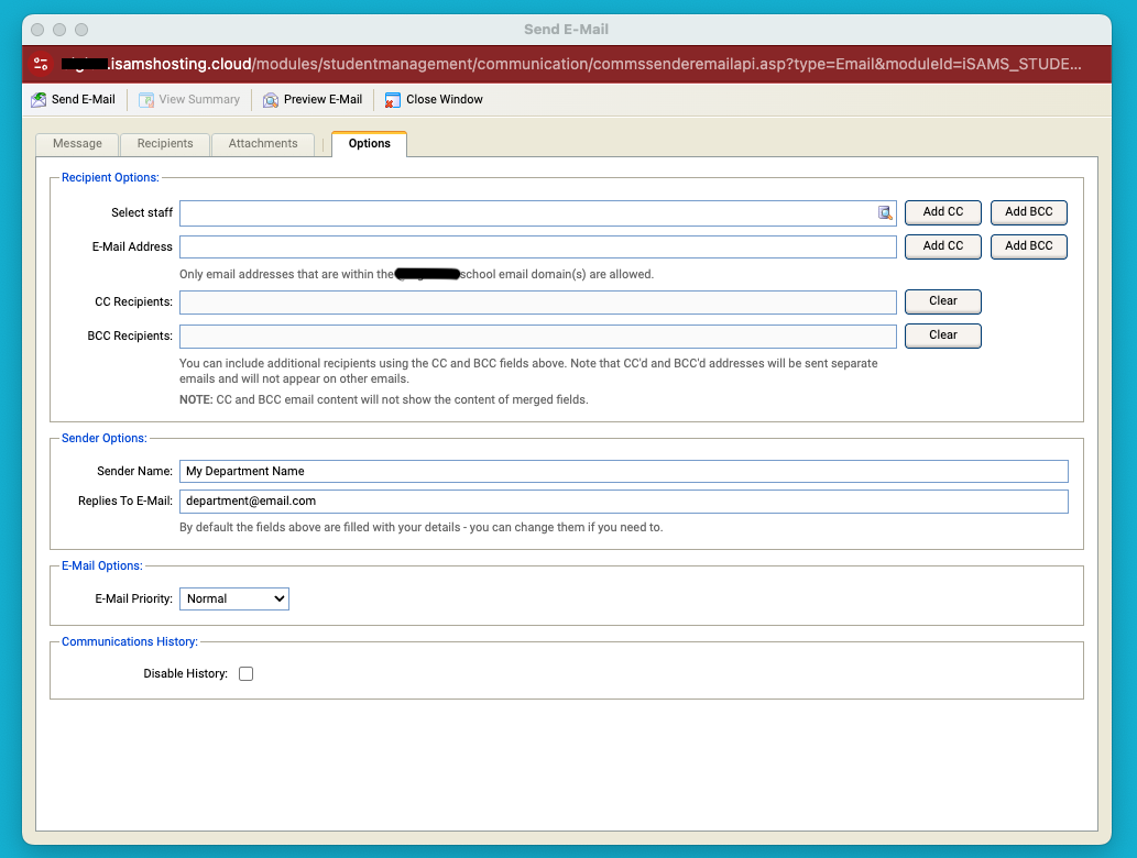 To override the Sender Address to become the Department Name and Department Email, one must override manually the Default user name & email address. This becomes repetitive and introduces human error.