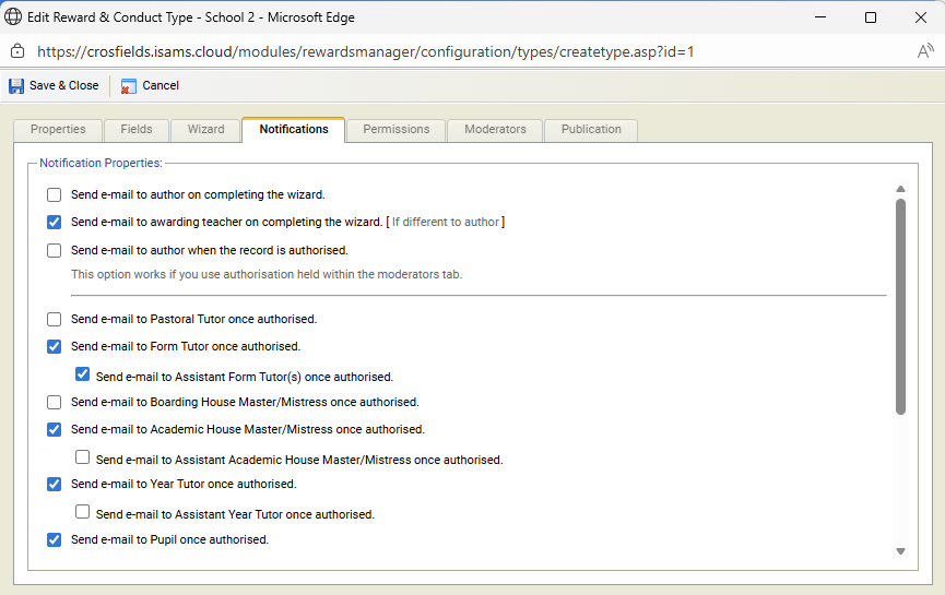 Currently, notifications in the Rewards and Conduct module are configured at the module-type level and apply school-wide.